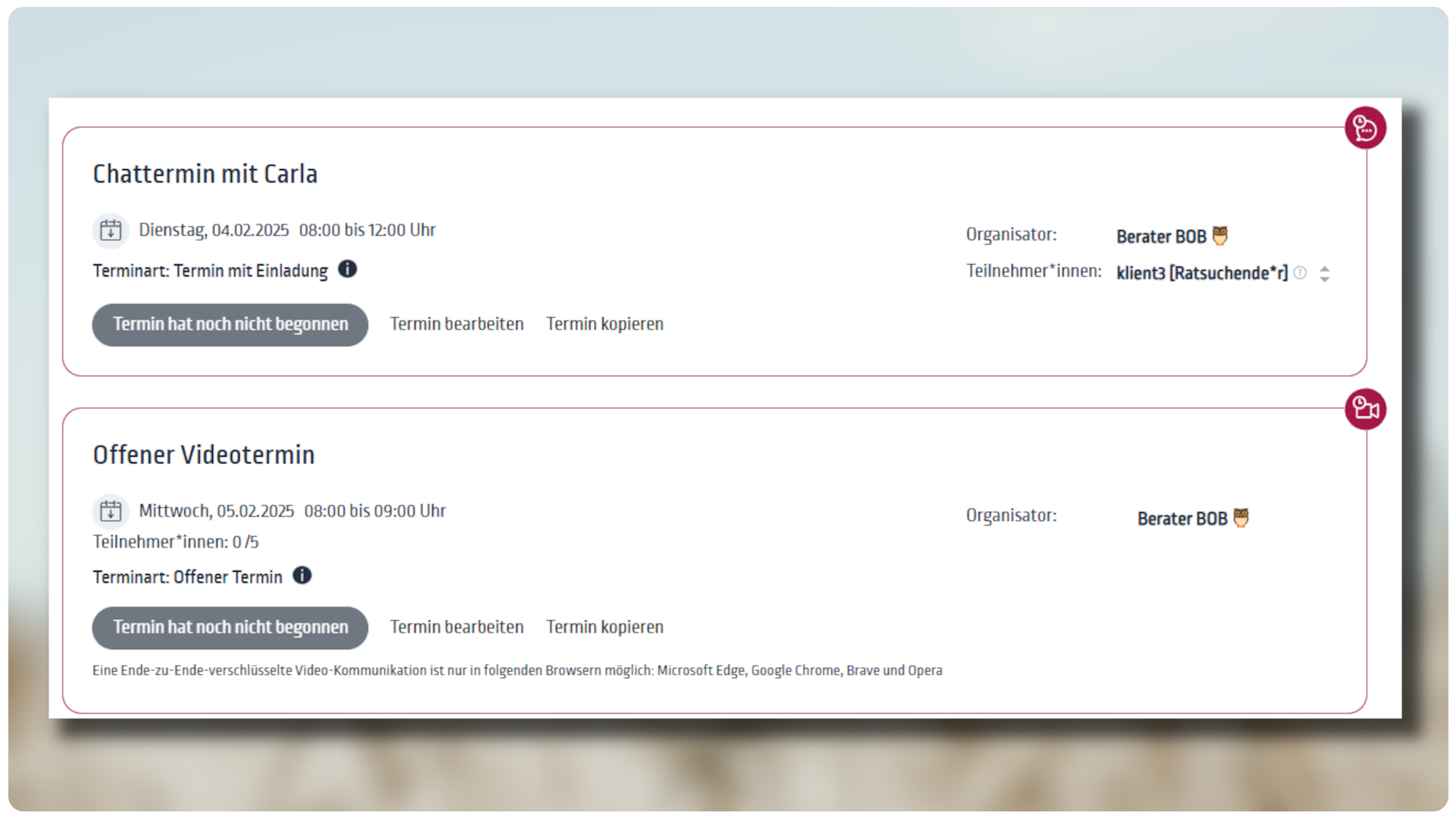 Planen und verwalten Sie Ihre Termine flexibel und effizient. Unser Terminmodul bietet Ihnen zahlreiche Möglichkeiten: offene oder persönliche Termine mit Einladung, Einzel- oder Gruppentermine, mit oder ohne Vorab-Buchung – Sie legen die Rahmenbedingungen fest. Die nahtlose Integration in unsere Chat- und Videoberatung sorgt für einen reibungslosen und strukturierten Beratungsprozess.