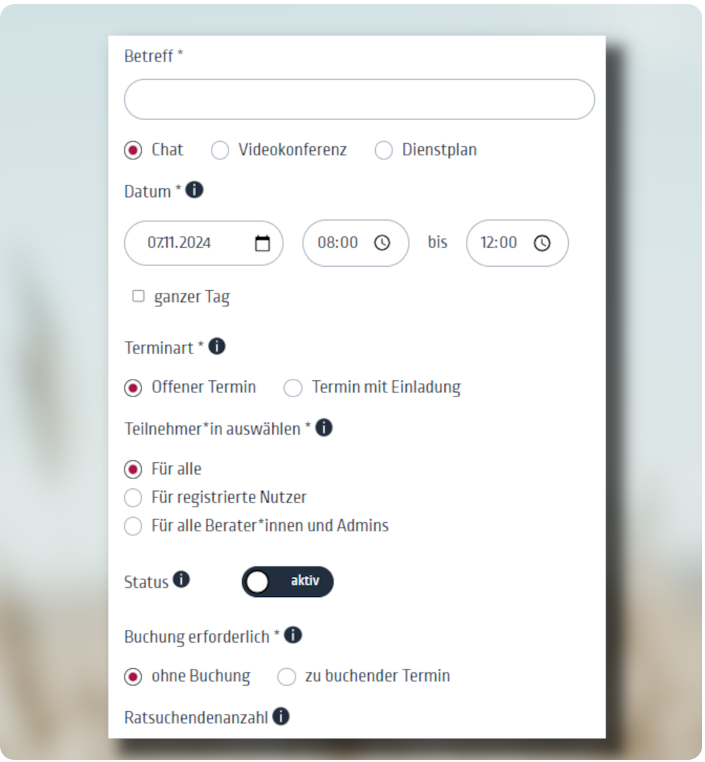 Dank vielfältiger Terminarten und Einstellungsmöglichkeiten passen Sie jede Beratungssituation optimal an. Ob wiederkehrende oder einmalige Termine, offene oder geschlossene Sitzungen – Sie haben die volle Kontrolle. So gestalten Sie Ihre Terminplanung effizient und passgenau für Ihre Beratungsangebote.