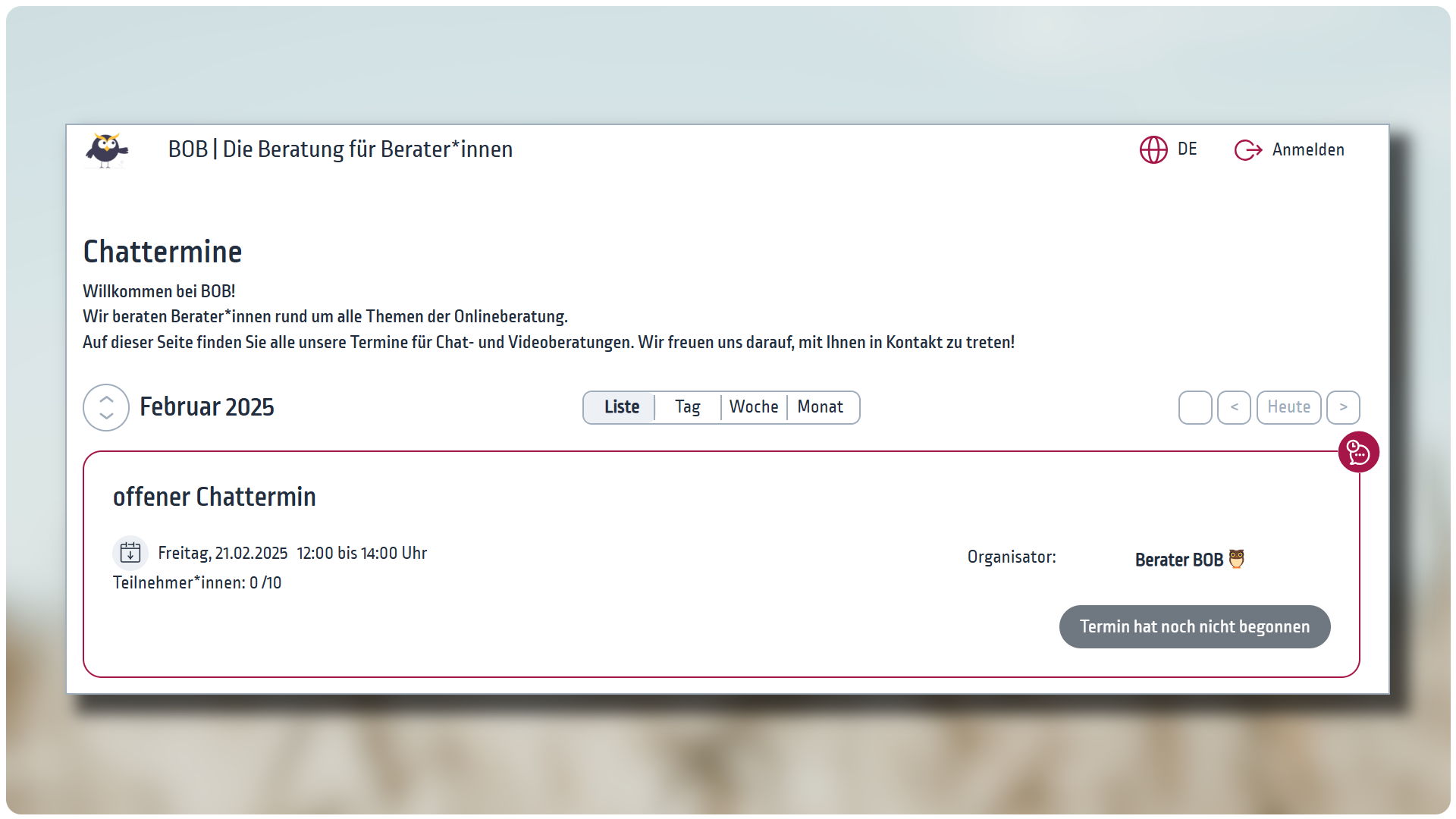 Zusätzlich zu dem persönlichen Kalender jeder Nutzer*in hat jede Beratungsstelle einen öffentlichen Kalender. In diesem Kalender sind alle öffentlichen offenen Beratungstermine aufgelistet und veröffentlicht (Chat- und/oder Video-Termine), die sowohl von registrierten als auch von nicht registrierten Ratsuchenden wahrgenommen werden können. Offene Termine können immer anonym betreten werden.
